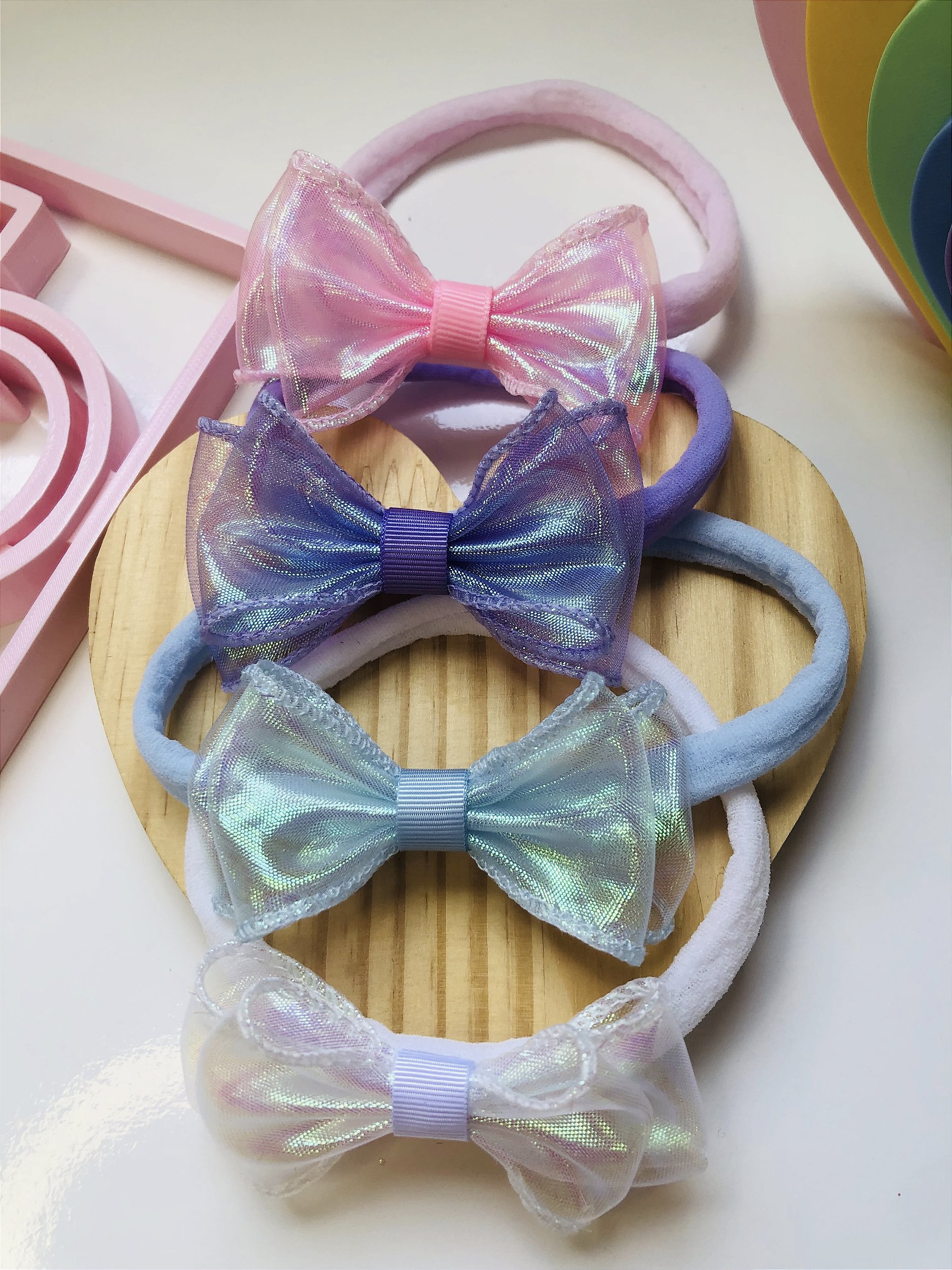 Fiaxinha slim na meia de seda com fita holográfica, cores disponíveis: Rosa, azul, lilás e branco. Tamanho: 7,5 cm