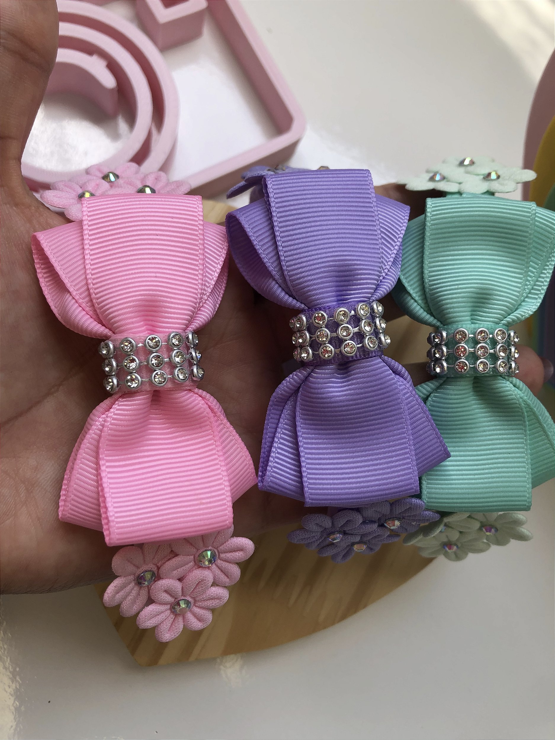 Faixinha slim para beês modelo laço cruzado com flores, disponível em 3 cores.