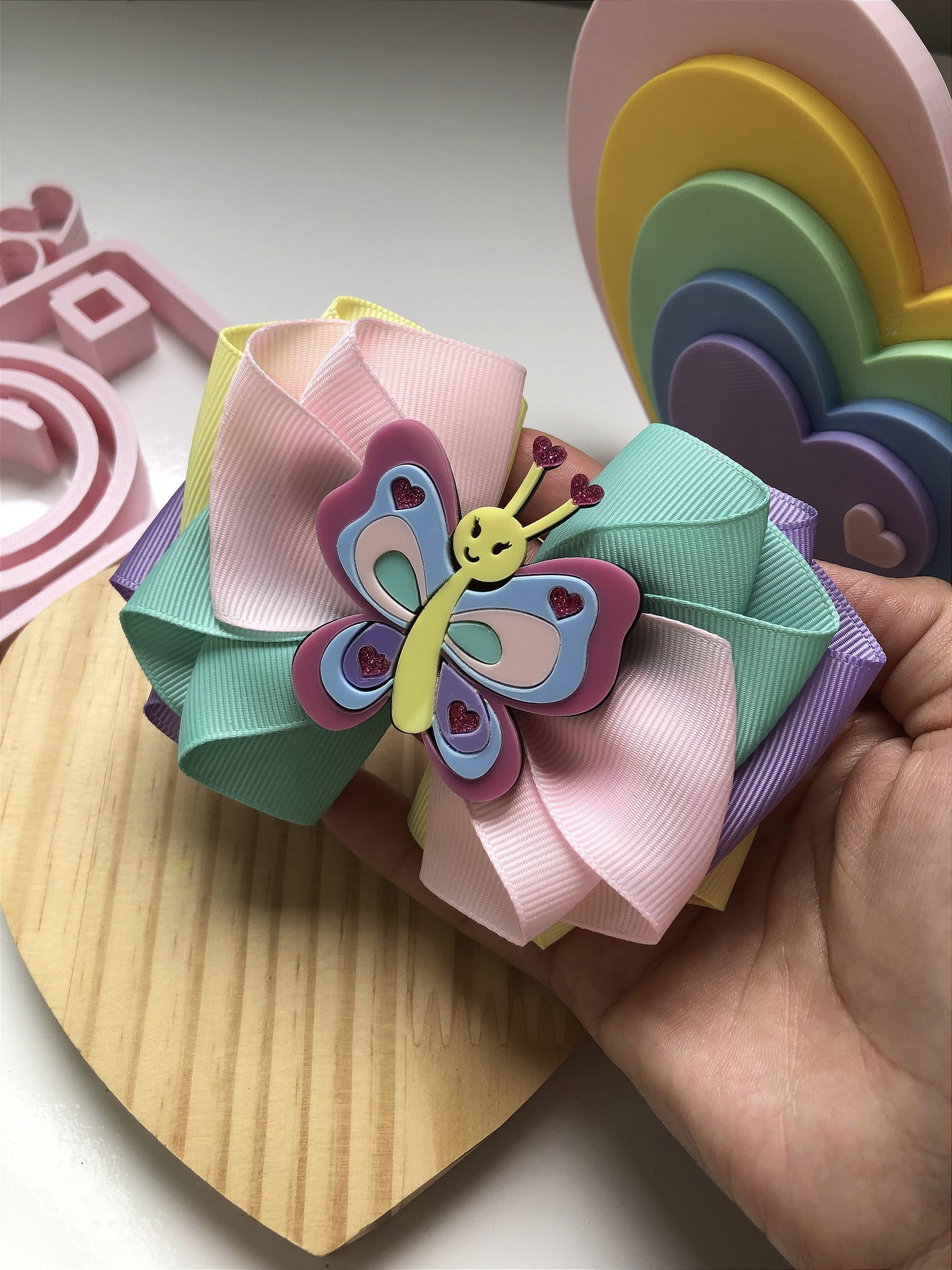 Laço modelo Mylena colorido, com aplique borboleta.Tamanho: 11,5 cm
