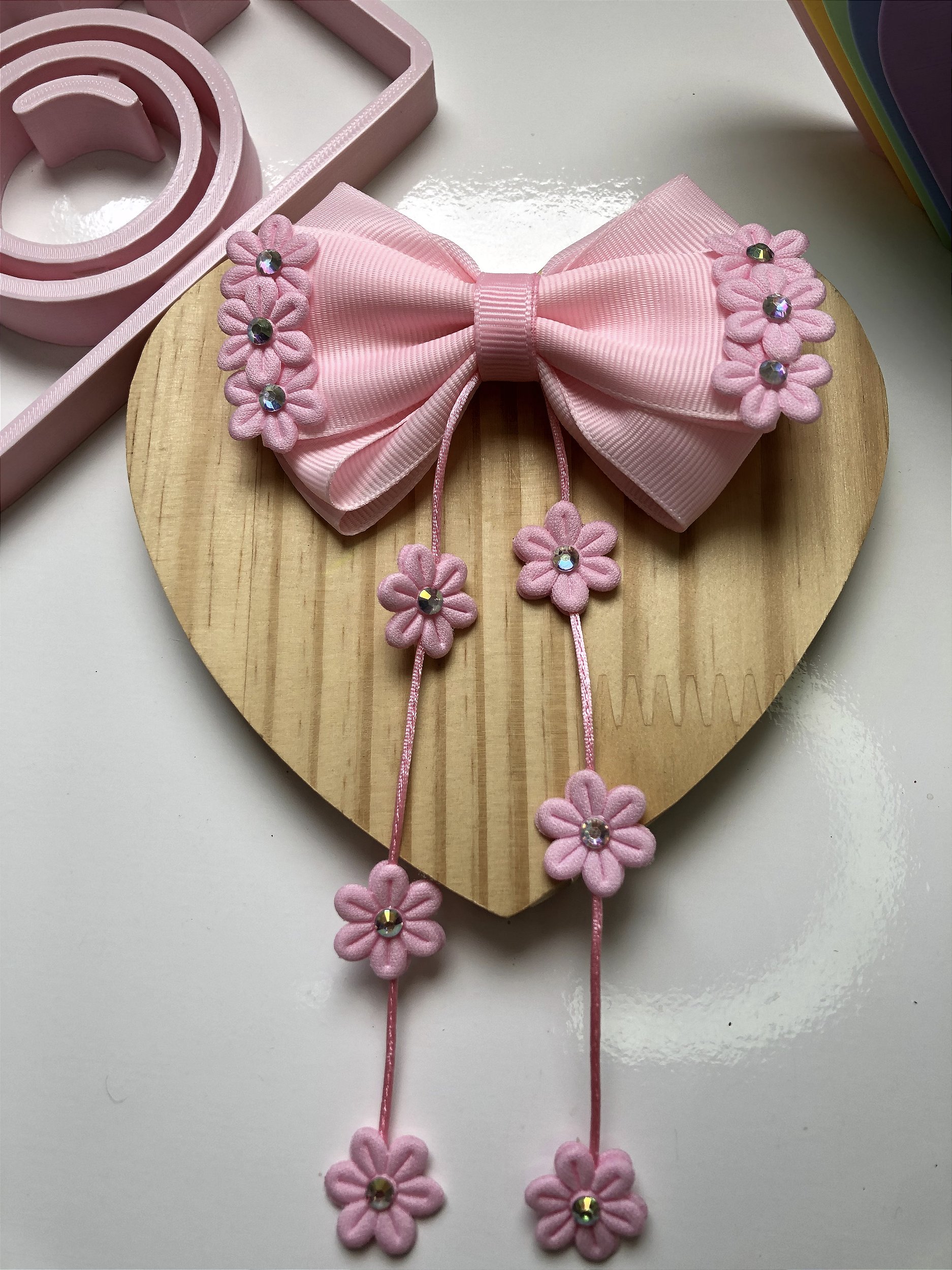 Laço modelo cruzado com detalhe em flores e cordão de flores também, tamanho: 10 cm