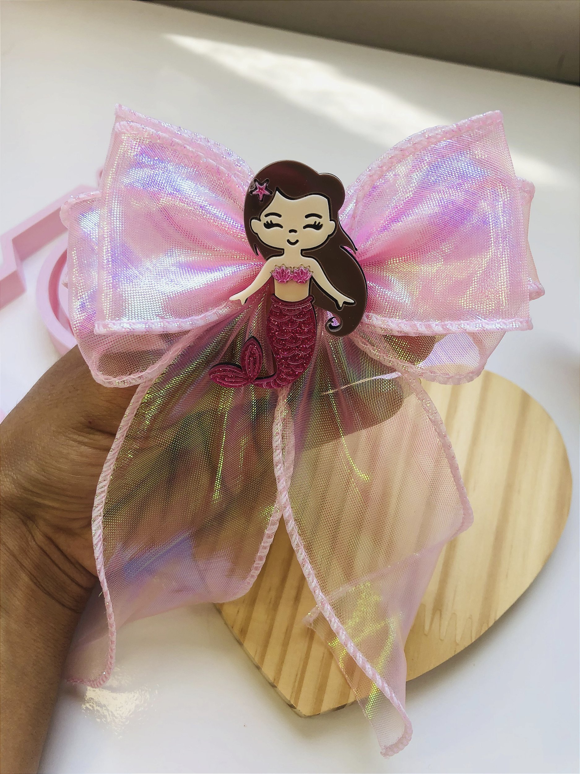 Laço coleção verão com aplique de sereia na fita holográfica, no bico de pato semi encapado. somente 1 disponível